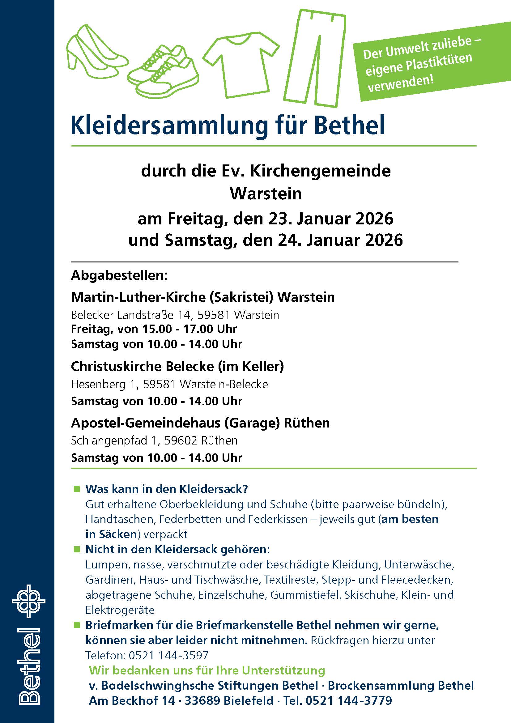 Der Umwelt zuliebe – am 23. Januar und 24. Januar 2026 sammelt die Ev. Kirchengemeinde Warstein Altkleider für die Brockensammlung der v. Bodelschwinghschen Stiftungen Bethel.