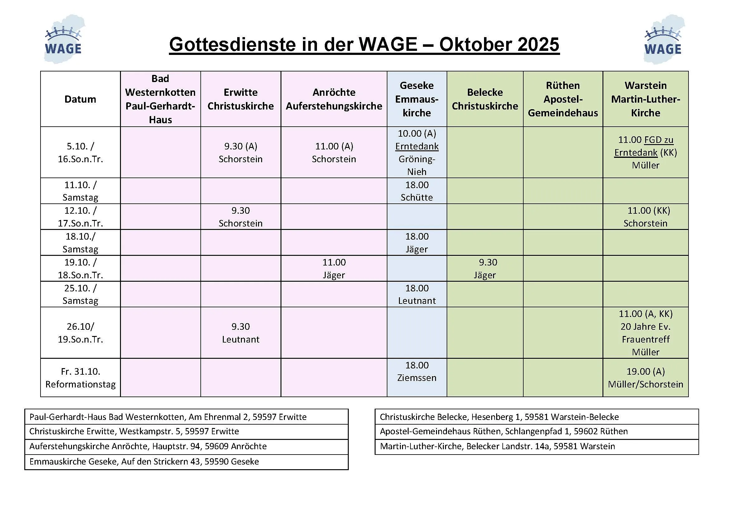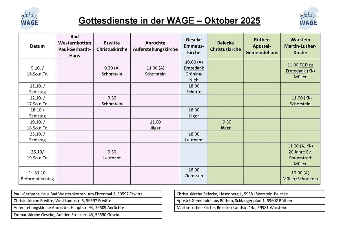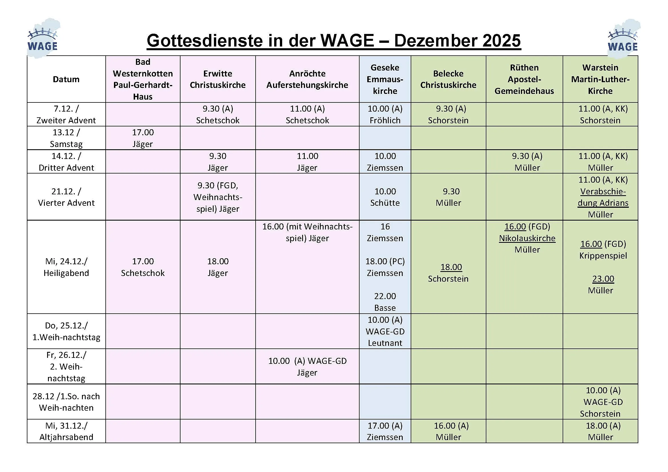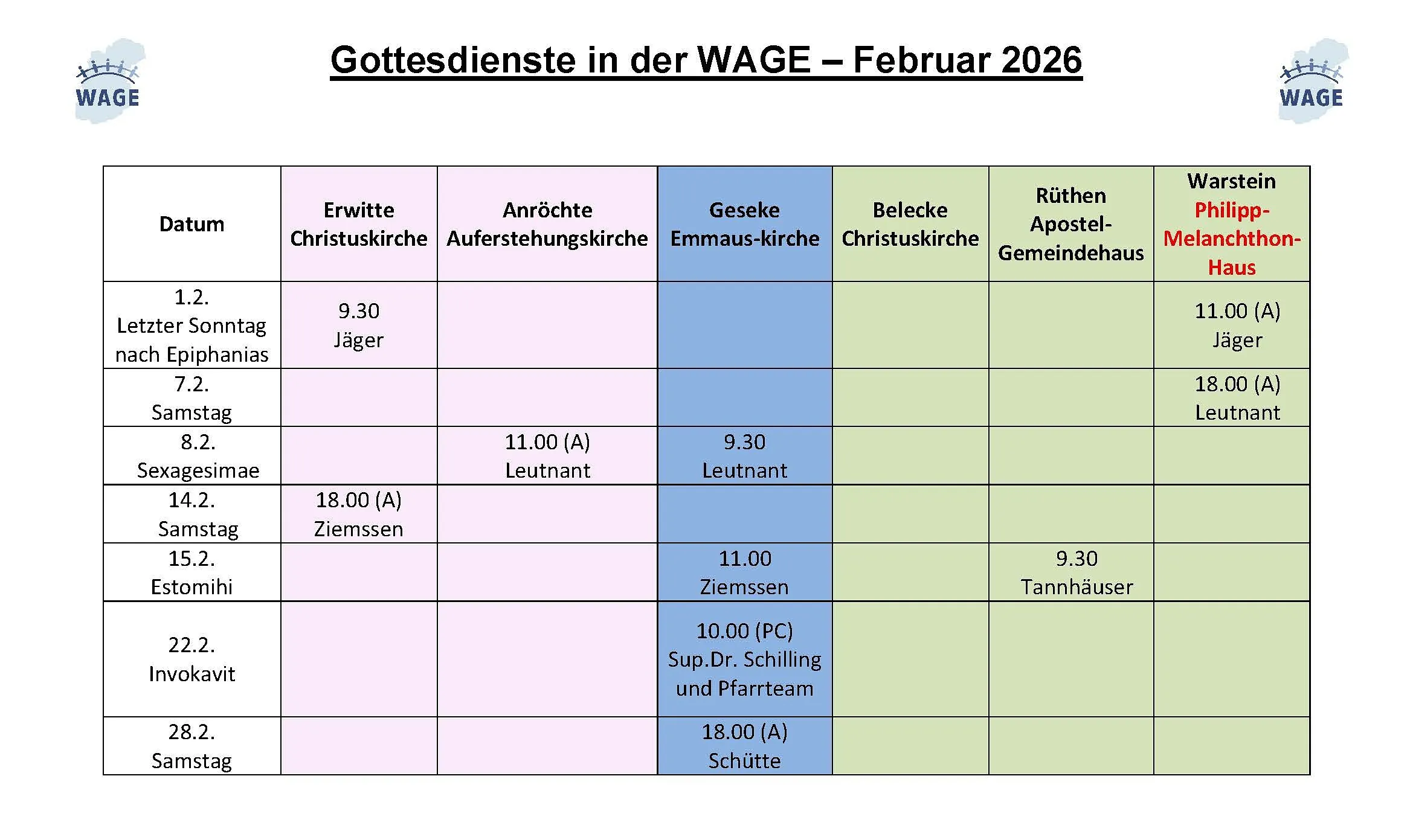 (A) = Abendmahl ; (T) = Taufgottesdienst; (FGD) = Familiengottesdienst; (Jugo) = Jugendgottesdienst; (PC) = Posaunenchor; (Ch) = Chor;