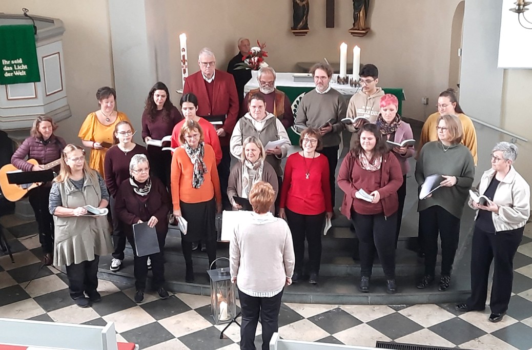 Unterstützt wurde die Gottesdienstgemeinde dabei vom Projektchor unter der Leitung von Bianca Sina (siehe Foto). Dem Schlussapplaus der Anwesenden fügte der Projektchor die Bitte hinzu, dass sich doch auch noch mehr Männer zum Mitsingen finden mögen.
